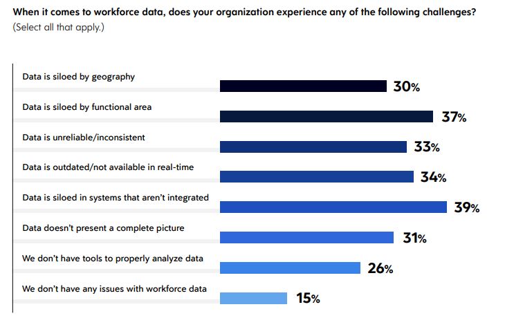 53% said their HCM is not integrated into other systems, and 43% say the HCM doesn’t provide the right data. Just 15% said they generally had no issues with their people data – the biggest challenges were siloed and outdated data.