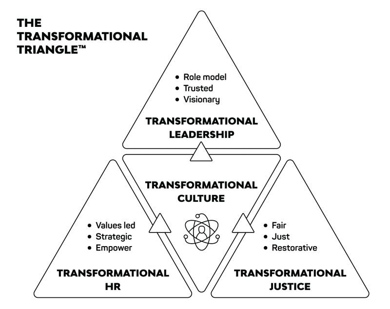 The Transformational Triangle model below represents the three elements of a transformational culture: transformational HR, transformational leadership and transformational justice. These three elements work in harmony to influence the development of a transformational culture.