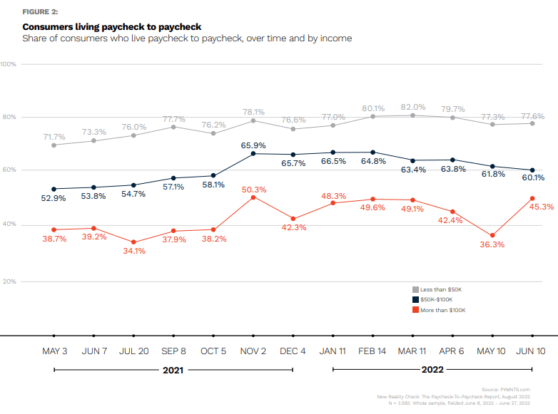 52% of those earning between $100,000 and $150,000 were living paycheck to paycheck – this is up 11 percentage points since May 2022.