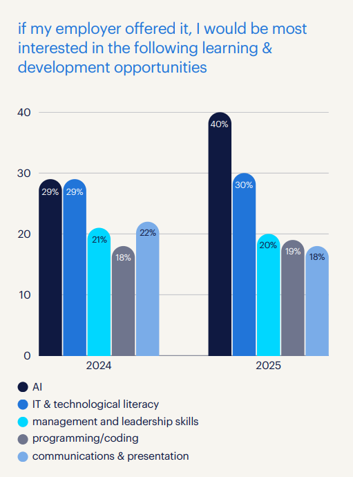 Plus, just 44% trust employees to invest meaningful around AI and tech, which were the most in-demand skills in 2025.